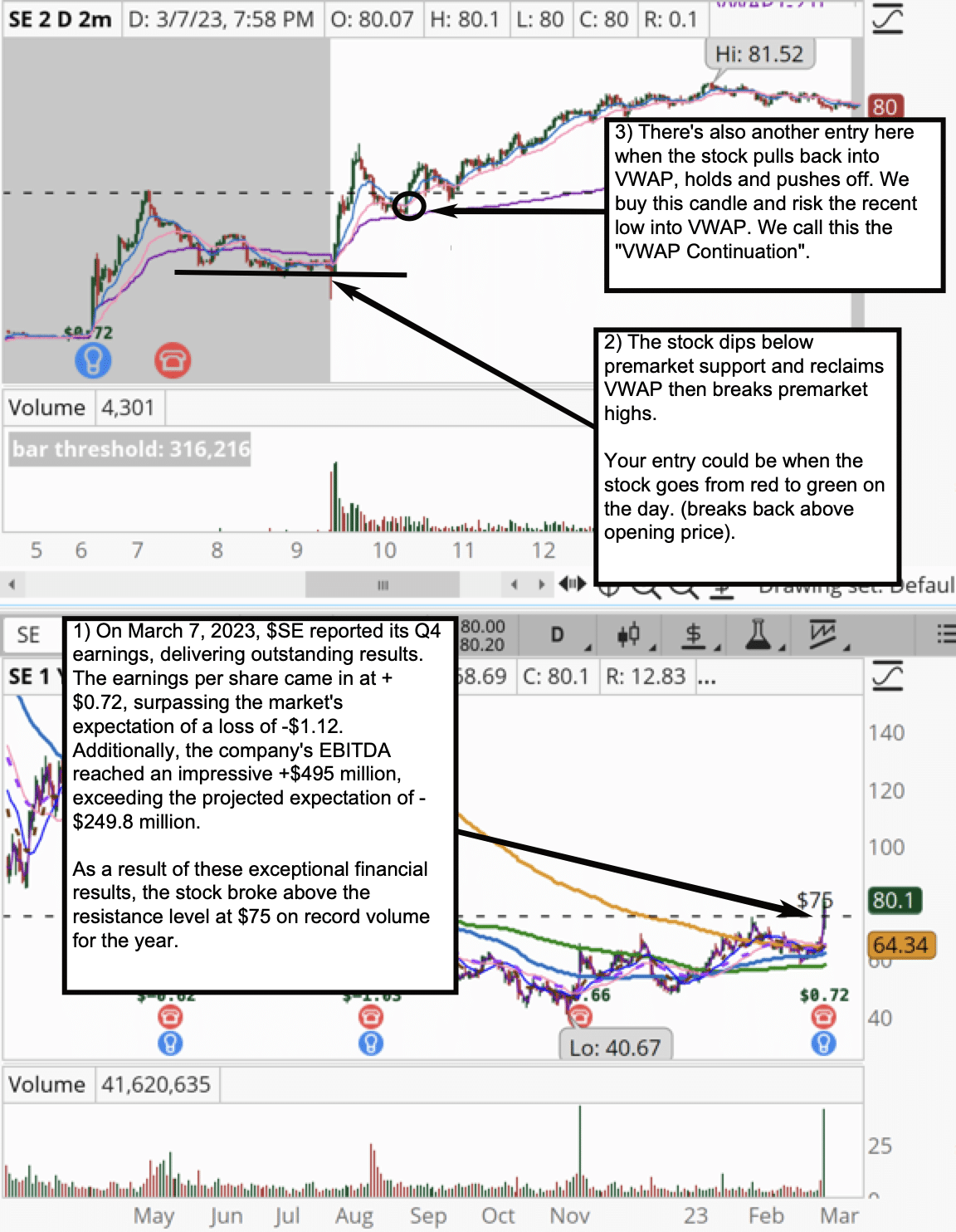 In this example, I want to showcase one of the strongest intraday earnings patterns traders often encounter. By examining the 2-minute chart, we can observe a significant gap up in the stock price following the earnings release, followed by a period of consolidation that holds the gains as a sort of shelf leading into the market open.