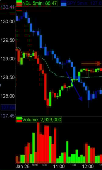 On Friday, January 28th, I was going through the stocks in play on the SMB radar to find a setup to trade. The SPY had already come off hard off of the 130 level, and I was cautious to initiate a short position. It was a little frustrating because if you were not short before the move actually happened it was difficult to get short; regardless, I was trying to find a consolidation to get into when I came across one of my favorite setups.