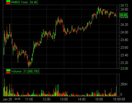 I was banging around in RMBS, a stock that did not accentuate my trading skills today. RMBS had just one more downmove in it for me whenever I had size.