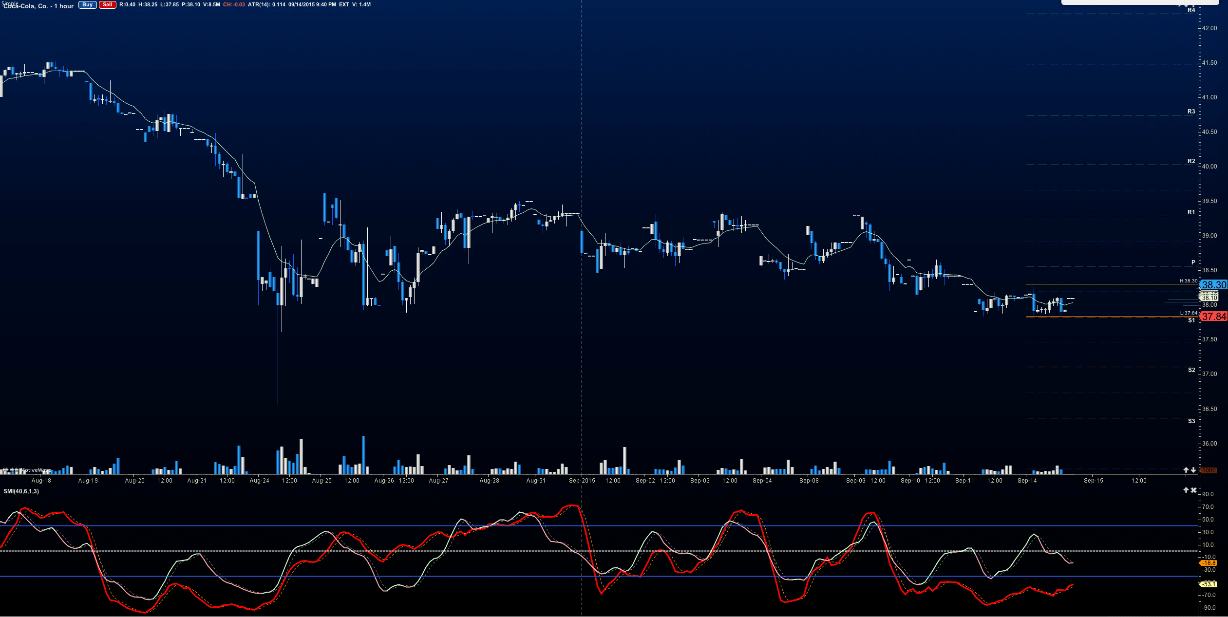If the KO chart fails to hold 37.7, I’ll put a conditional order for THE FOLLOWING DAY in to go short at 38 in a half sized position; my stop will be in the 38.4 region. If it retraces into 38.4 and begins to fail with negative momentum, I will add to the position as it loses 38 once more to make it full sized. My initial targets downward will be 37.36, 37.1, 36.73 -If the chart fails sharply, I will come back to the trade setup and look for adjusted entries.