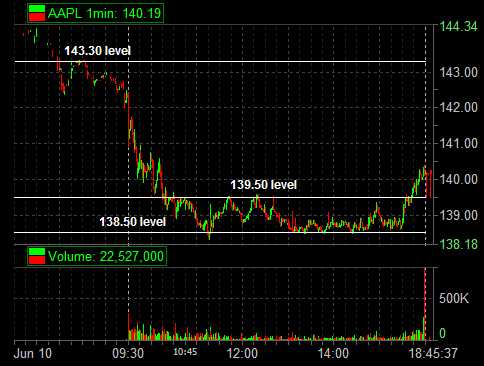 Based on all of the above I was interested in being short AAPL the day following the Mac conference. I was hoping that it would open around 142.70 and I could identify the seller who had previously driven it down during after hours trading the previous day. My initial downside target would be 140 which had shown support the prior day. On a failure below 140 my expectation was a down move to 138.30 the 5 day low.