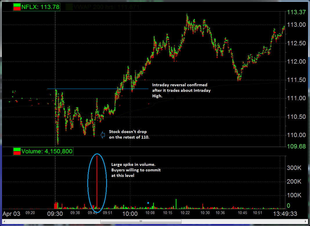 But there was a second chance to cover for a small loss. NFLX touches 110 again and there are buyers waiting to support the bid. Perfect chance to get out of your short if you are not stubborn. And finally we see a large spike in volume indicating this area will be defended by longs and then an intraday reversal pushes NFLX several points higher.