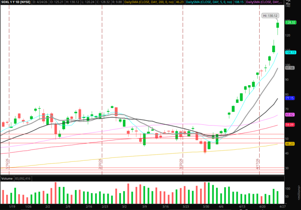 In an ideal world, we get a gap up in SOXL or a continuation to the upside over the next day or two. If that were to happen and price were to extend for another day from the 5-day, I’d look to open a swing short position. In order to size up the trade, I need to see the sector fail to follow through (lower high / take out prior days’ low or key support / relative weakness to the overall market), or I’d need to see a blow-off move to the upside met with a hard rejection and level to trade against. Also, I’ll be paying close attention to key sector names and their performance relative to the sector and the market, such as NVDA, TSM, ARM, AVGO, INTC, and AMD.