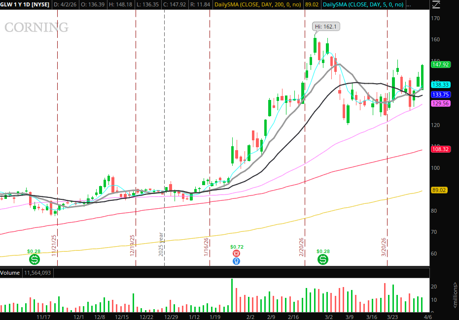 GLW: A leading name within one of the leading sectors so far YTD. If dips continue to be bought, the 10-day SMA might serve as the stop and guide a multi-day breakout if the market holds steady.