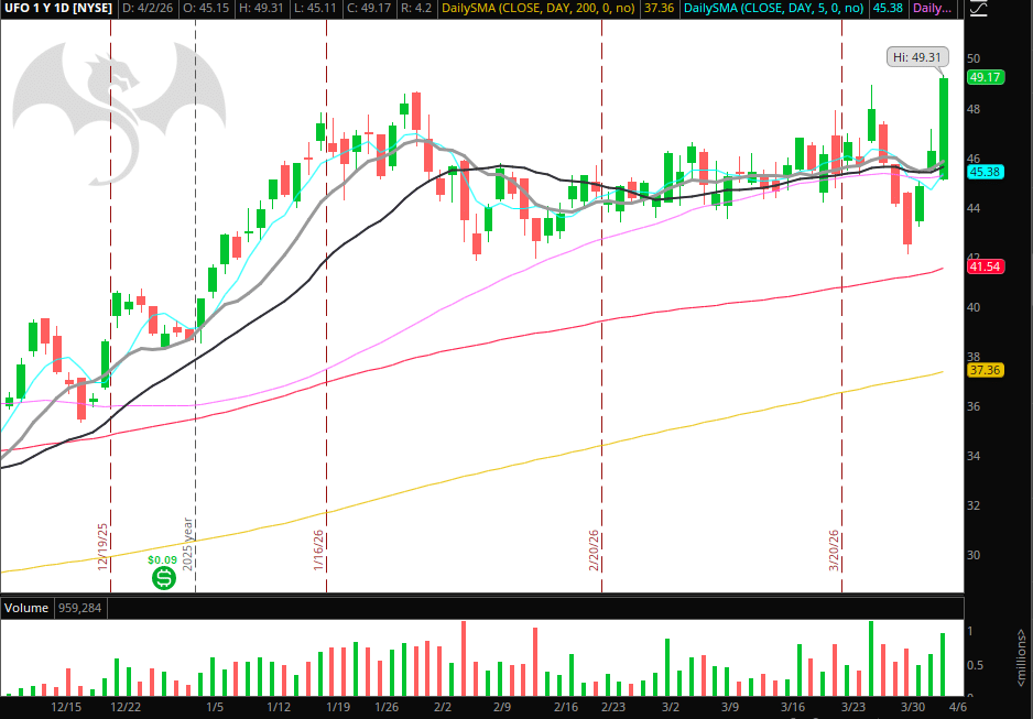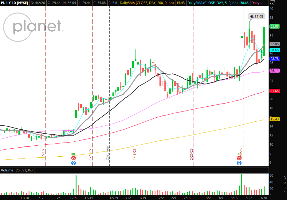 PL is the standout leader in the sector. I wouldn’t enter at these prices for a swing because its price has already extended from its 100- and 200-day SMA. Therefore, if it were to pull back and hold near $34, I might look for a continuation long on the dip, but I wouldn’t look for anything beyond 2-3 days of continuation. Whereas, with UFO and RKLB, I’d be looking to maintain a core for much longer.