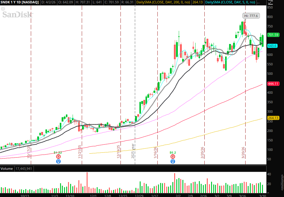 SNDK: Building out a fresh base and range. I wouldn’t be surprised to see outperformance to the upside as soon as/if the market regains key SMAs.