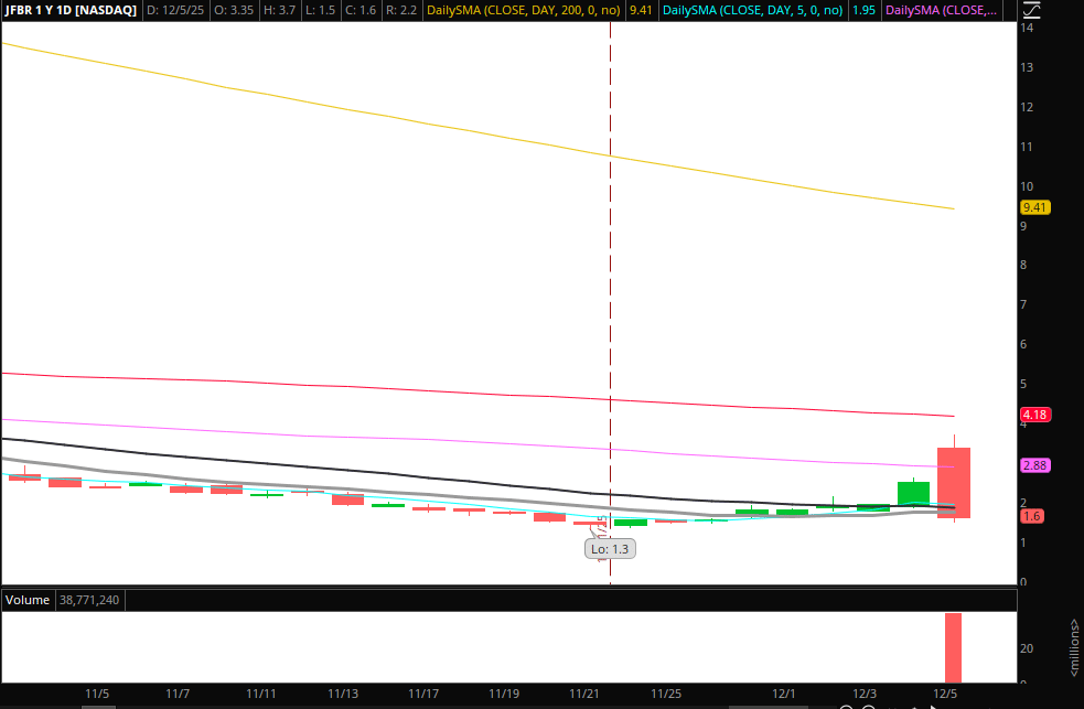Pops to Short in JFBR: Given the enormity of the selloff on Friday, I don’t believe this will set up; however, it’s worth alerts. I’ll have alerts in the name for a push toward 2.5 – 2.9, in case it has a quick pump into its 2-day VWAP, indicating failed follow-through and a short.