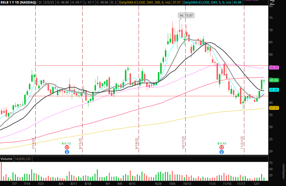 Continuation in RKLB: Another fantastic swing from last week. After coming into the targets and the 100-day, I’m now looking for a day or two of rest before another potential long entry, then push toward its 50-day and $55 region.