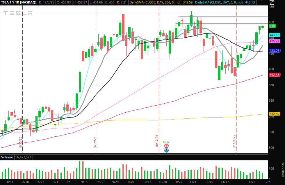 Stalking an A+ Breakout in TSLA: As I mentioned in my recent IA meeting, the move I am looking for in Tesla is separate from the trade I discussed in Thursday’s meeting. On a higher timeframe, Tesla continues to consolidate in a tight coil. From the weekly, down to the daily, it’s a beautiful setup that aligns well. The trigger? I’d look to enter long for an A+ breakout and swing trade if this gets above $470s again. Until / and if that happens, I’ll hope this spends some time consolidating in the upper end of its coil’s range, building up some energy and contraction ahead of a potential breakout.