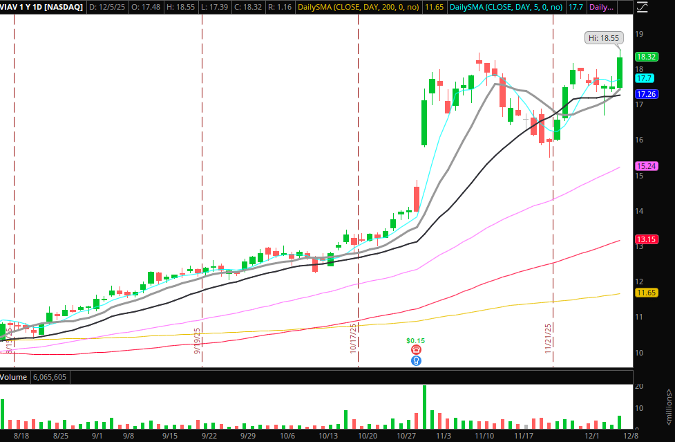 Continuation in VIAV: For a new entry here after missing Friday’s breakout, I’d need to see a higher-low / quick check-in at the multi-day VWAP, and support being found.
