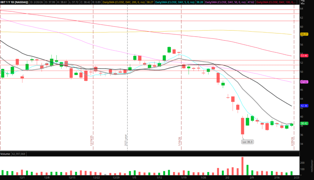 IBIT: If this reclaims its 10-day SMA and shows slight relative strength, I might look for a long entry with a tight LOD stop to see if it can build out. Alternatively, as with IGV, if it fails to reclaim and breaks last week’s low, I would be aggressively short. The same plan goes for ETHA.