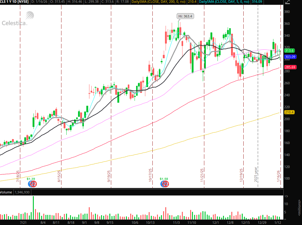 CLS: Consolidating well, looking for a breakout entry, potentially starting near $320.
