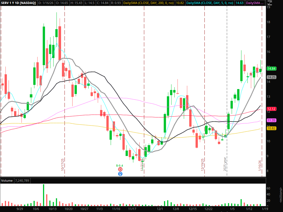SERV: Consolidating above its 10-day SMA. Looking for further build, strength, and a breakout above last week’s high to stick.