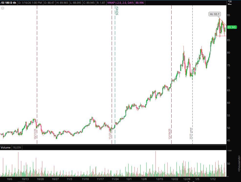 Alright, going forward, I have a very small position left on the short side. I’m looking for failed follow-through in the current consolidation, and would look to add my size back should we break below major support, which is now at $87 give or take in futes. If /SI breaks out and holds over this resistance, I’ll be flat the position.