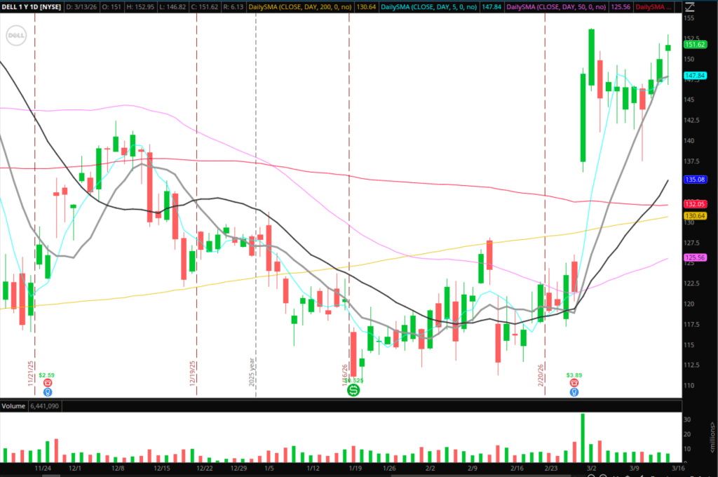 Another name, which has also shown fantastic relative strength and bucked the market’s trend, is DELL, following its earnings at the end of Feb. I’ll closely monitor this name as well, if the above scenario plays out, for continuation above $ 153-ish.