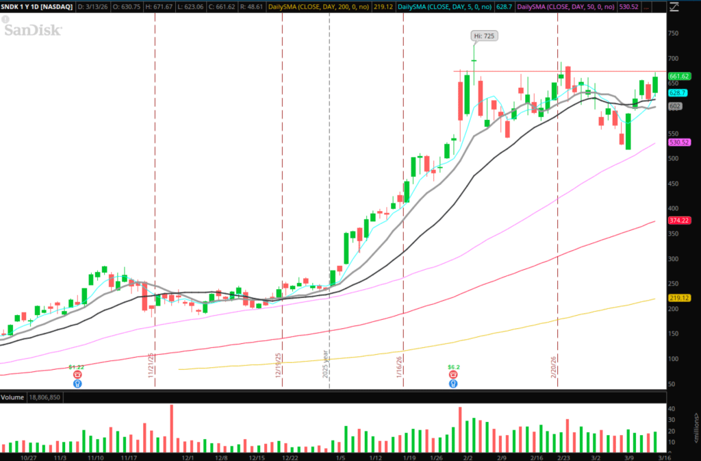 Consolidation Breakout in SNDK: The relative strength in Sandisk over the prior few weeks has been notable, to say the least. Now, whilst consolidation breakout swing trades have not been working in the current market, I still want to keep this on close watch for a breakout over last week’s high / $700.