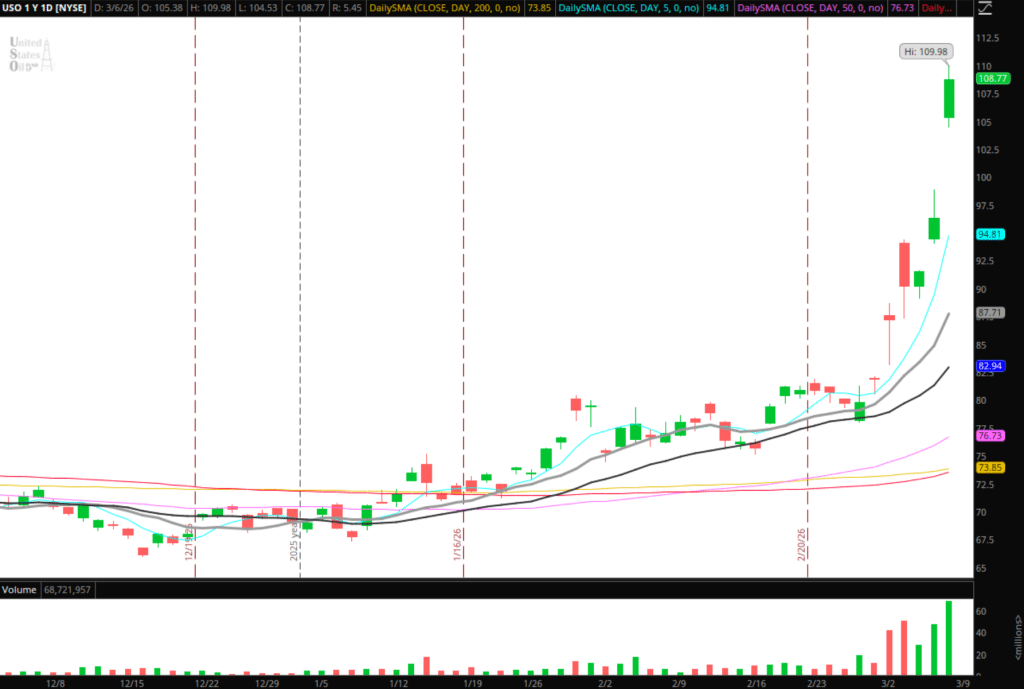 Breaking News / Mean Reversion in USO: RSI closed near 89 on Friday in USO, which is just remarkable. Along with the RSI, we’ve got volume expansion and consecutive gap days, and a major extension from the 5-day SMA. Typically, that would line things up for an A+ mean-reversion short on Monday for me, either with a gap-and-fade or an FRD setup. But, this is obviously macro-related, and so, like the Silver trade, it’s not as straightforward. But I’ll just stick to intraday trades in USO for this watchlist.