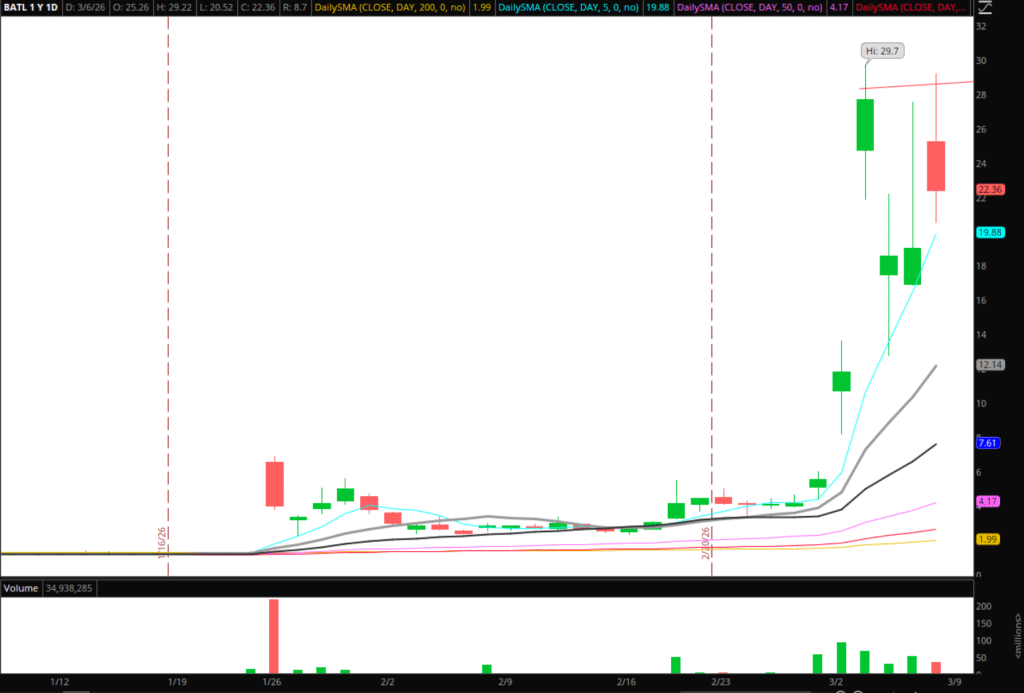For example, if BATL, the leader of the small-cap theme, were to gap up on a USO gap or re-test $26-$28 and fail, I’d be short. We’ve now seen that area hold firm as resistance across multiple days. Alternatively, if USO gaps lower, I’d look to short pops in BATL as long as the multi-day VWAP (from Friday) holds steady as resistance.