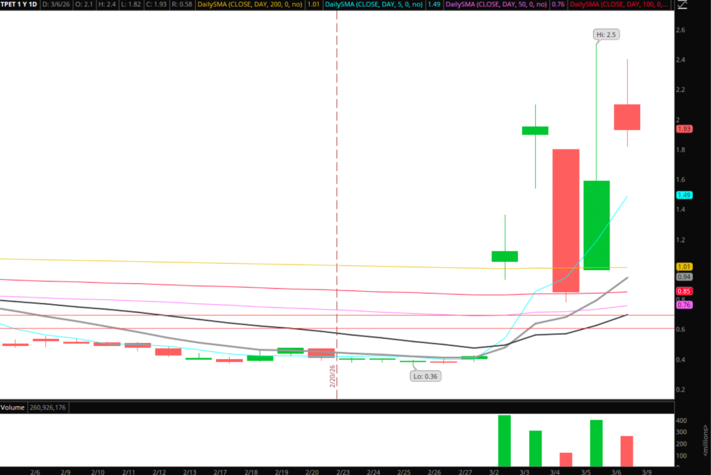 Similarly, in TPET, $2.2 – $2.4 is beginning to shape up as major resistance. Unless Oil truly is a black swan, I’m inclined to short pops in TPET that fail, with a HOD stop. Alternatively, if we see weakness in Oil, I’ll be focused on shorting TPET intraday on failed pops toward $2 – $2.10, or on holding below Friday’s low.