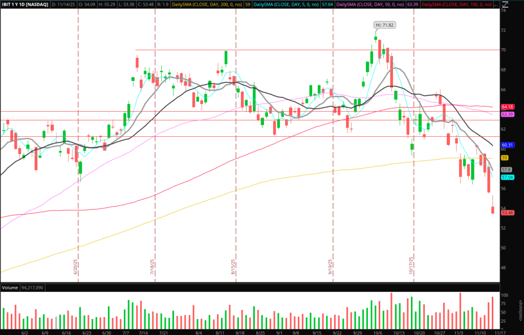ETHA / IBIT: Great relative weakness on Friday. In an ideal world, we get a gap down / flush lower, followed by capitulation, to set up an A+ bounce opportunity. If we grind lower, that downgrades the setup immensely. Alternatively, suppose IBIT/ETHA breaks its relative weakness trend against the market and holds above the 2-day VWAP / VWAP from Friday. In that case, I’d look for continuation to the upside with an intraday trail. However, as I’ve said before, the only long as it relates to IBIT and ETHA that I’d risk-on would be capitulation to the downside.