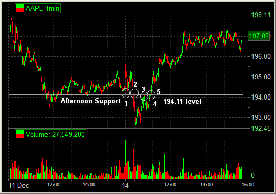 I would like to discuss an important intraday level that we identifed in AAPL from Friday’s trading action. The level was 194.11 and we were able to use it a bunch of times the past two days. 194.11 acted as a key support level from 12:00pm to the Close on Friday. We highlighted this level as a good place to get long AAPL on the Open if it touched this price. Stocks that gap above prior afternoon’s support tend to bounce off of this level right on the Open.